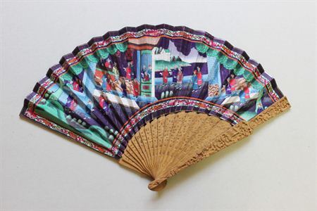 Leque chinês, com folha de papel pintado, representando cenas de rua e de interior, e figuras chinesas, com rosto de marfim e indumentária de seda. Guardas e colo de sândalo com decoração vazada e relevada, com motivos vegetalistas e figurativos. Altura: 33 cm. Data: 1870-1880. Doado por Luisa Barroso Crespo - Museu Nacionaldo Traje e da Moda (MatrizNet).