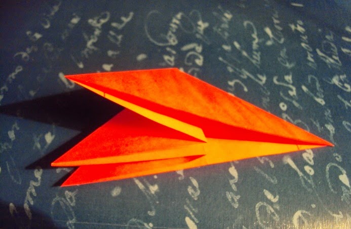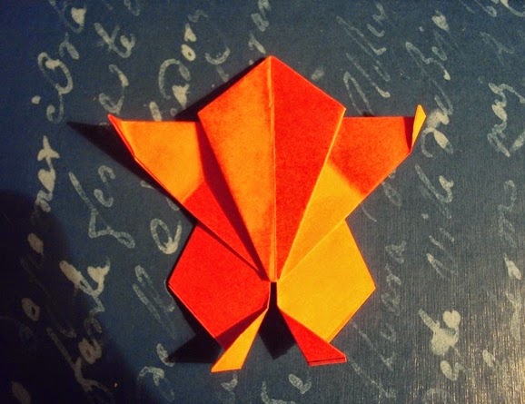 7 - Vira para baixo a ponta do triângulo da direita e una até à base (imagem 7). Vire esta ponta para cima para fazer um braço. (imagem 8).