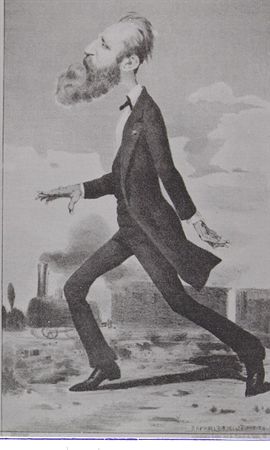 Caricatura de Henry Burnay, Album das Glórias - compra, vende, troca, empresta, põe, dispõe, impõe, repõe, fia, fura e faz, litografia sobre papel, 1882 - Museu José Malhoa