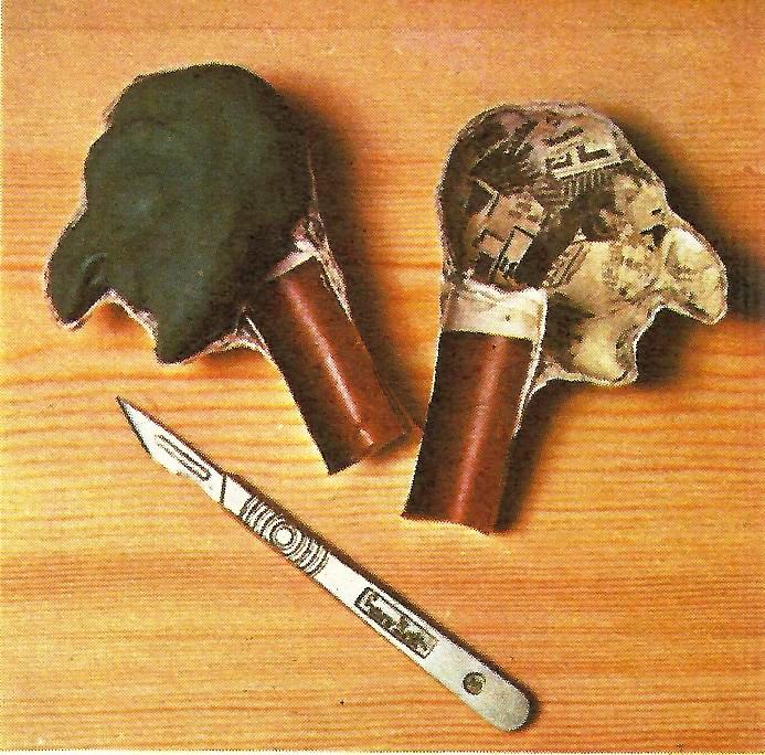 2 – Amacie a plasticina ou o barro e modele a cabeça em volta do rolo (pescoço do fantoche). Faça os contornos exagerados (1).