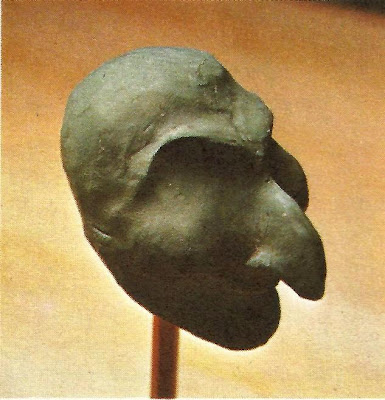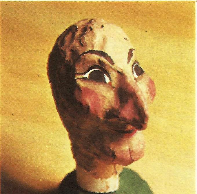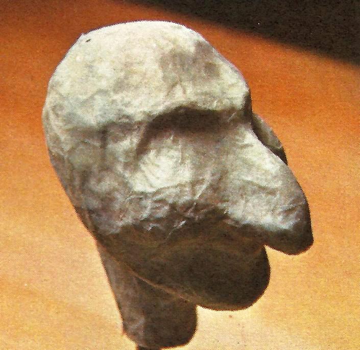 cabeça, os materiais utilizados são o barro e papier-mâché