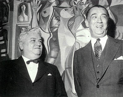 | Di Cavalcanti com o presidente Juscelino em frente a tapeçaria no Palácio da Alvorada (1956?). |