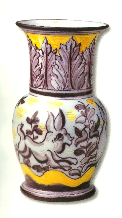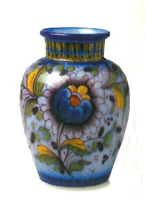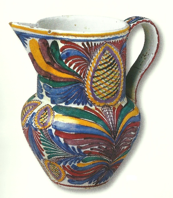 Canjirão, faiança rodada, pintada a azul, vermelho, amarelo, verde e manganês, alt. 23cm. Marcado O. A. L., com a sigla de José Pedro - Museu Nacional do Azulejo (2001). Cerâmica de Alcobaça de João da Bernarda [1875-1947]. Ministério da Cultura