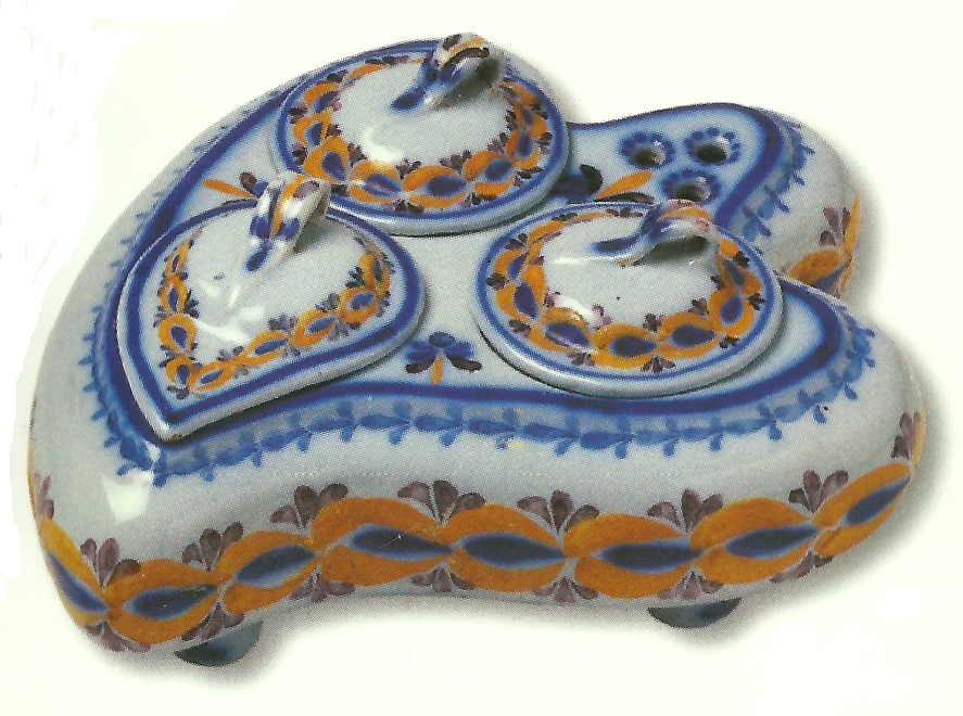Tinteiro, faiança modelada, pintada a azul, amarelo e manganês, medidas: 21cm x 17,5cm. Marcado O. A. L. Museu Nacional do Azulejo (2001). Cerâmica de Alcobaça de João da Bernarda [1875-1947]. Ministério da Cultura