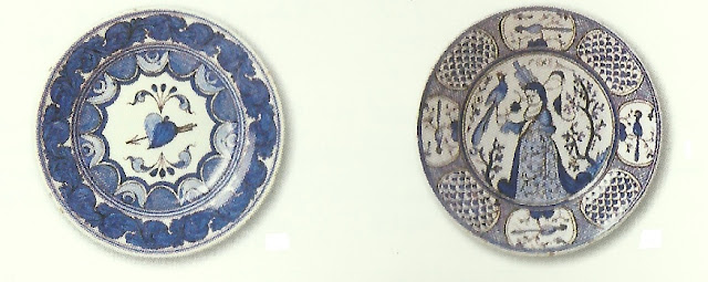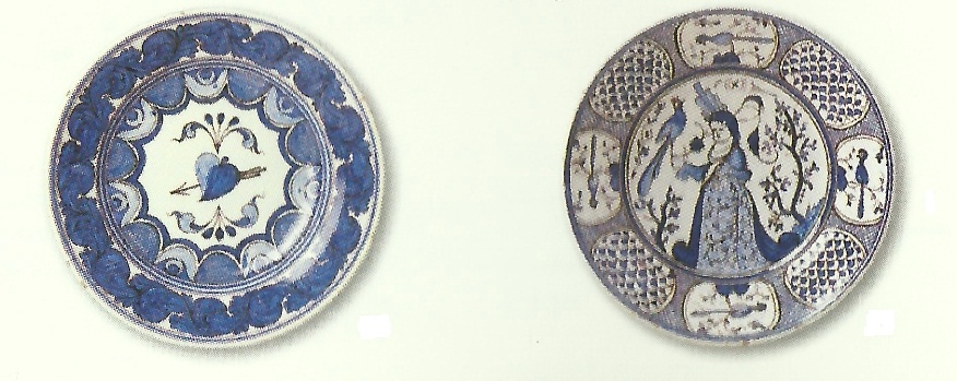 Prato, faiança rodada, pintada a azul e manganês, com motivos inspirados na cerâmica seiscentista de Lisboa, diâmetro: 45 cm. Marcado O. A. L. , com sigla de José Pedro. Prato, faiança rodada, pintada a azul e manganês, cm motivos inspirados na cerâmica seiscentista de Lisboa, diâmetro: 32 cm. Marcado O. A. L. Alcobaça - 1928, com a sigla de António Natividade - Museu Nacional do Azulejo (2001). Cerâmica de Alcobaça de João da Bernarda [1875-1947]. Ministério da Cultura