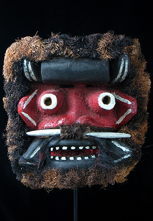 Máscara, povo Guere, madeira e fibras pintadas. ( Estas máscaras são muitas vezes são usadas durante funerais. Os olhos esbugalhados, os dentes desagradáveis e a trave no nariz são muito assustadores. Às vezes, conchas, sinos, pregos e outros elementos são associados. Esta máscara é nova e foi feita para a venda). - Máscaras no Mundo