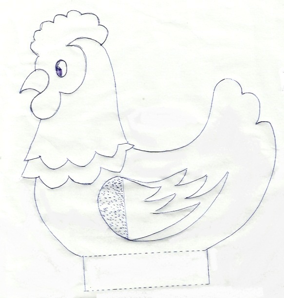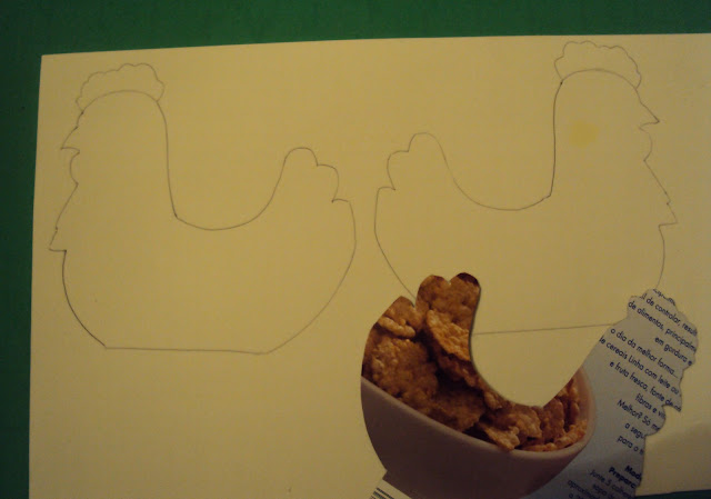 Coloque o molde da galinha sobre o EVA (branco). Com o lápis transfira para o EVA, imagem 4 (não transfira a parte tracejada, imagem 3).