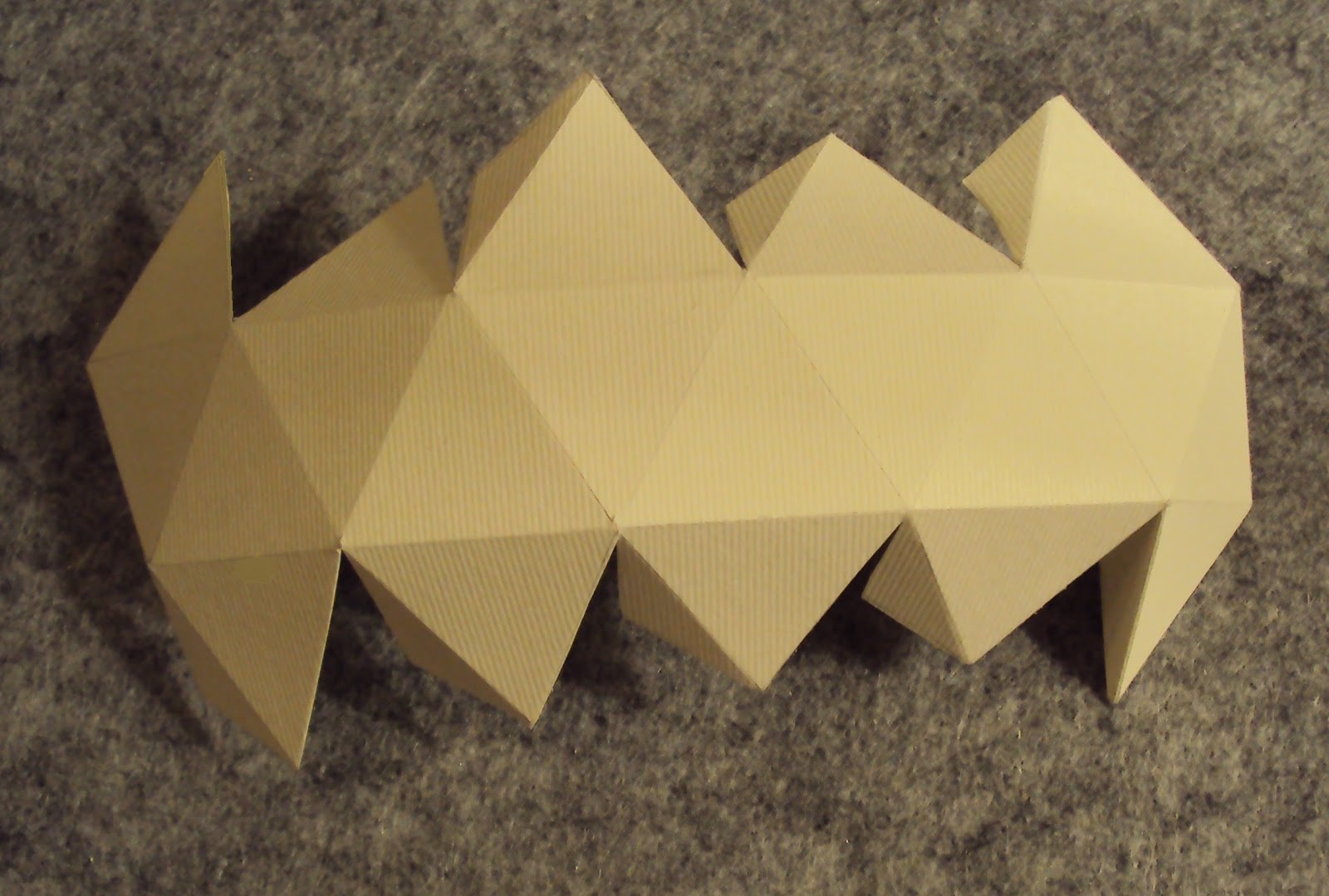 2 - Recorte o modelo do icosaedro. Dobre todas as faces pelas linhas tracejadas (arestas). Dobre as abas para o interior, imagem 3.