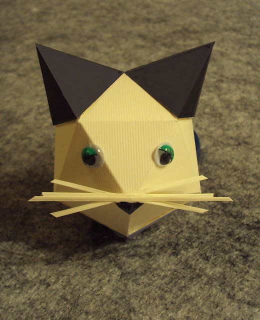O Gato Geométrico tem uma cabeça invulgar. É formada por um poliedro com 20 faces (triângulos equiláteros) denominado icosaedro regular. Sobre este estão as orelhas, constituídas por formas tridimensionais geométricas que se assemelham ao tetraedro. O corpo do gato é parecido com um cone.