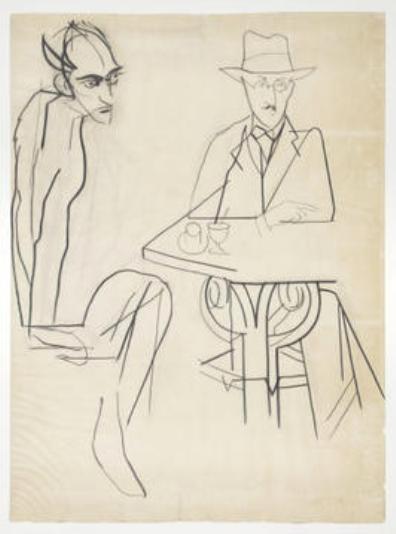 | Fernando Pessoa e Almada Negreiros, marcador sobre papel vegetal, 1983. Desenho de Júlio Pomar - FCG, Centro de Arte Moderna, Lisboa |