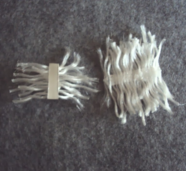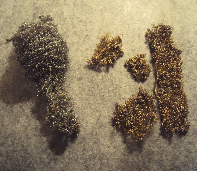 9- Corte um pedaço ao esfregão e divida em várias partes. Pinte com tinta em spray na cor ouro velho (imagem 12). Com estes bocados de esfregão, realize os cabelos e a barba.