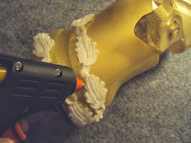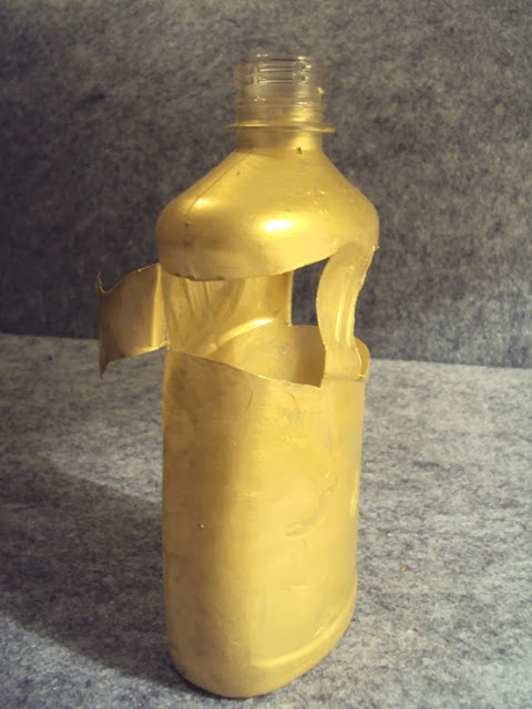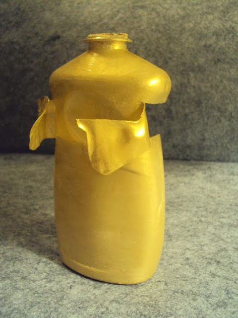 3 - Recorte os braços com a tesoura (imagem 5) e dobre-os para o exterior das garrafas. Pinte com a tinta acrílica na cor ouro novo (imagem 6).