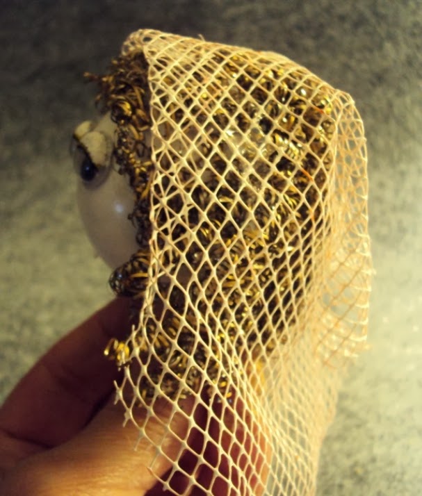 11 - Pinte com tinta na cor branco, uma das redes em nylon. Dê a forma de véu e cole com cola a quente sobre a cabeça da figura de Maria (imagem 15 e 16).