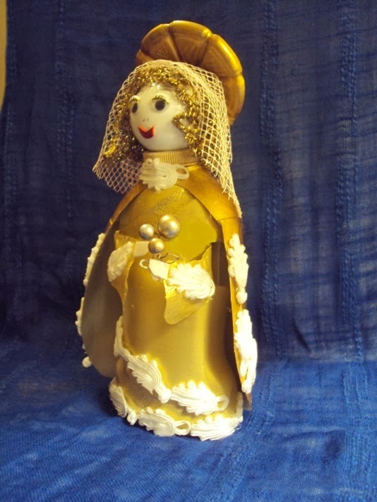 12 - Recorte o fundo de uma garrafa de água (1litro) em PET e pinte na cor ouro velho. Depois de secar cole a auréola sobre o véu da figura de Maria (imagens 17 e 18).