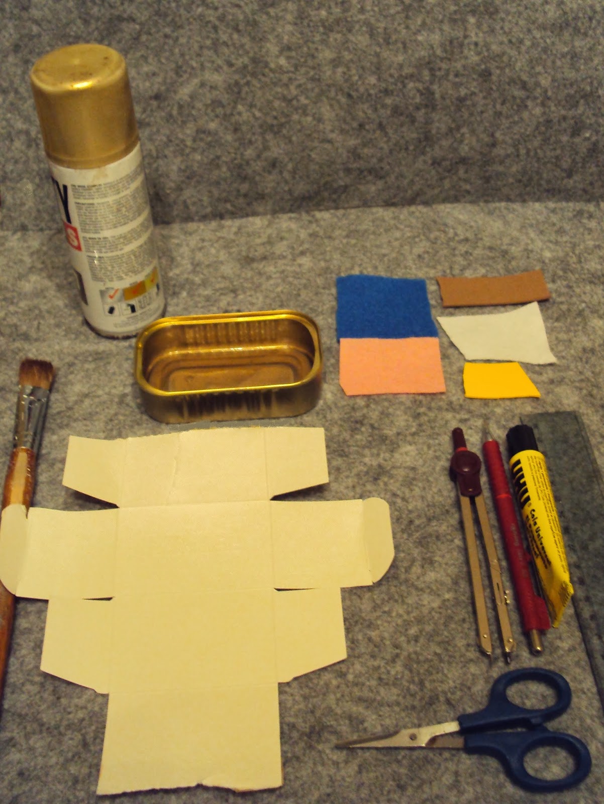 16 - Sobre a face superior da embalagem cole o rectângulo recortado. Pinte com tinta ouro novo. Coloque dentro da embalagem metálica as três figuras e cole (imagem 10).