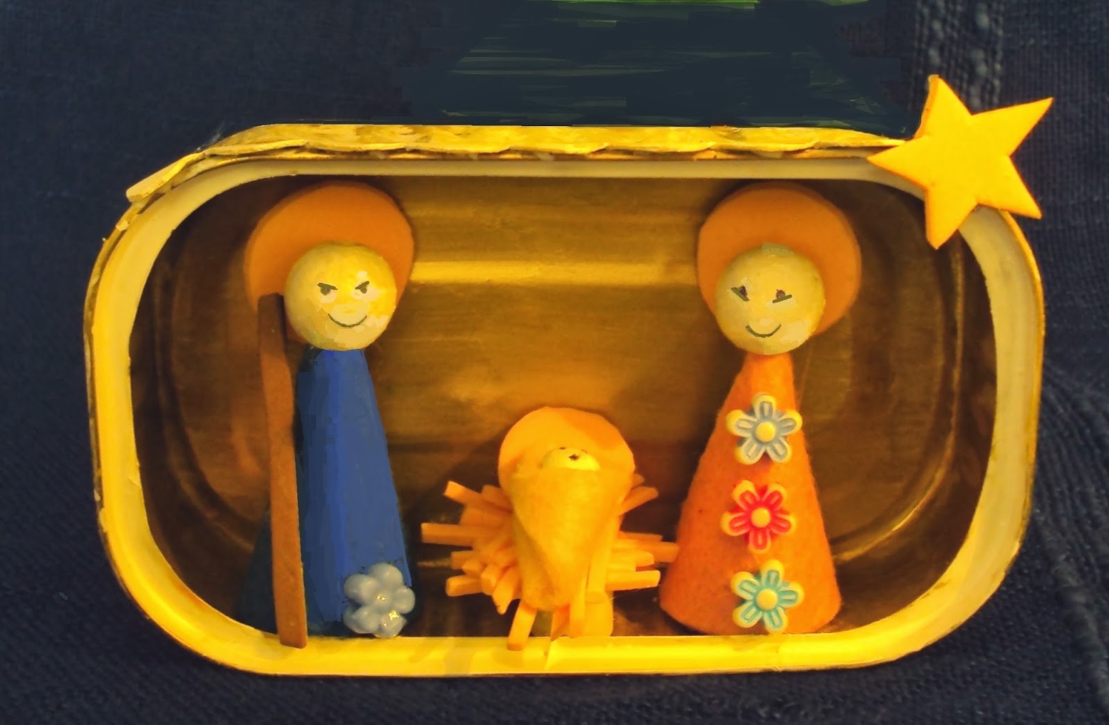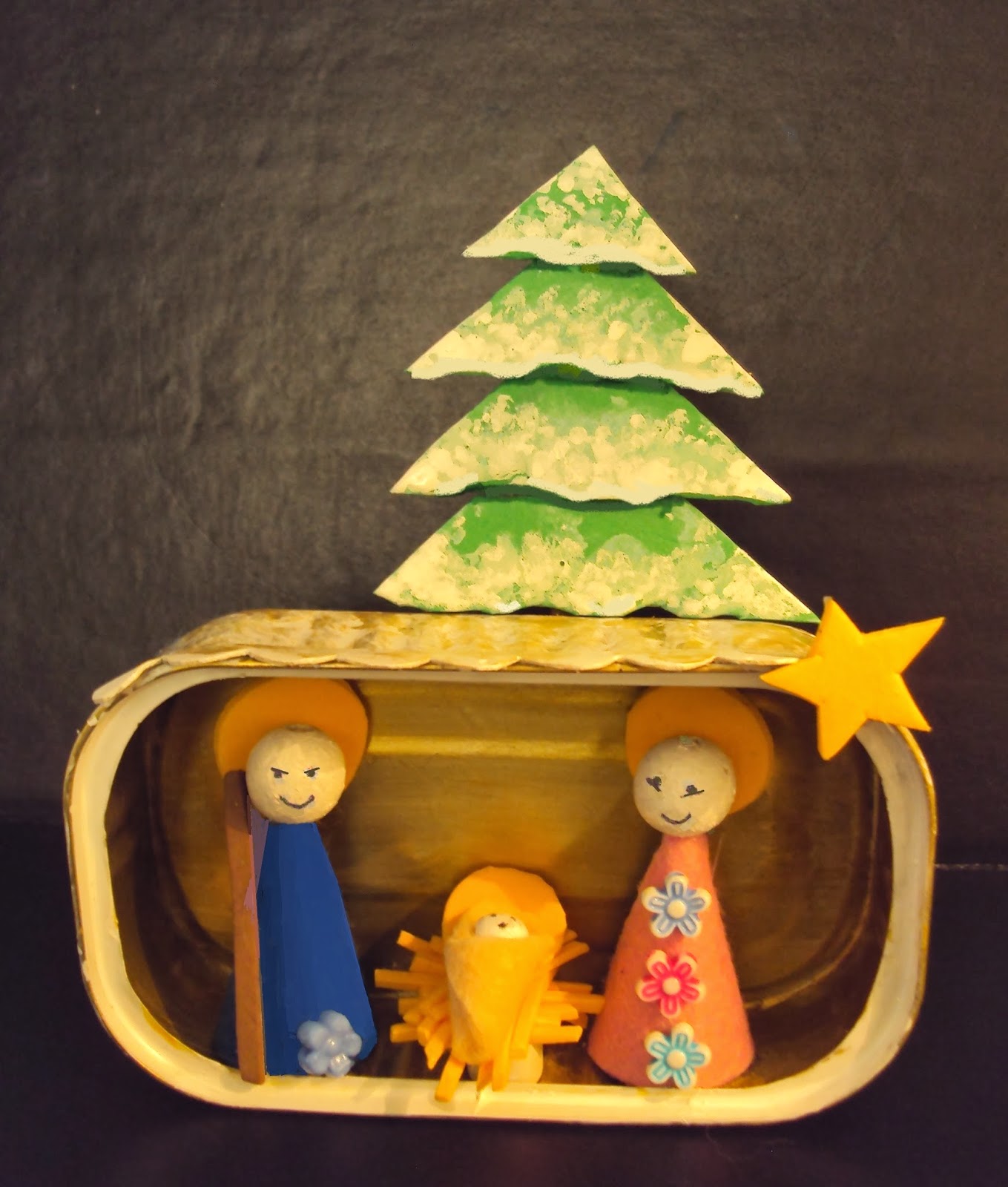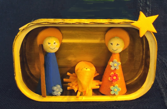 Este presépio em miniatura, com as figuras da Virgem Maria, São José e o Menino Jesus, ocupa o espaço de uma embalagem metálica de conserva que simula uma estábulo. Realizado com materiais reciclados como embalagem de cartão e de metal, bijouteria e desperdícios de feltro ou EVA, adapta-se a locais de dimensões reduzidas. Poderá ser uma boa opção para presente de Natal.