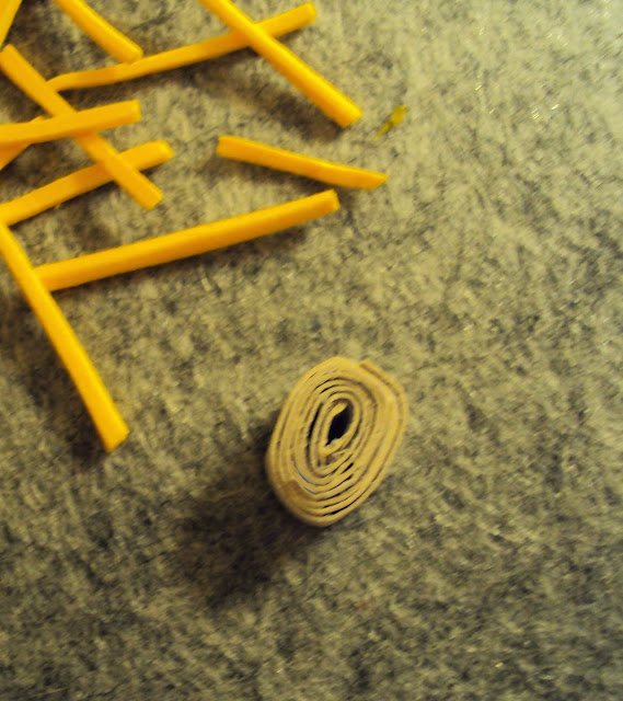 | 8 - Espiral em cartão. EVA cortado em pequenos rectângulos. |
