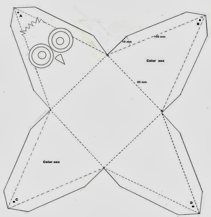 9 - Com o furador de papel, faça os furos A, B, C, D, nos sítios indicados no molde (imagem 2).