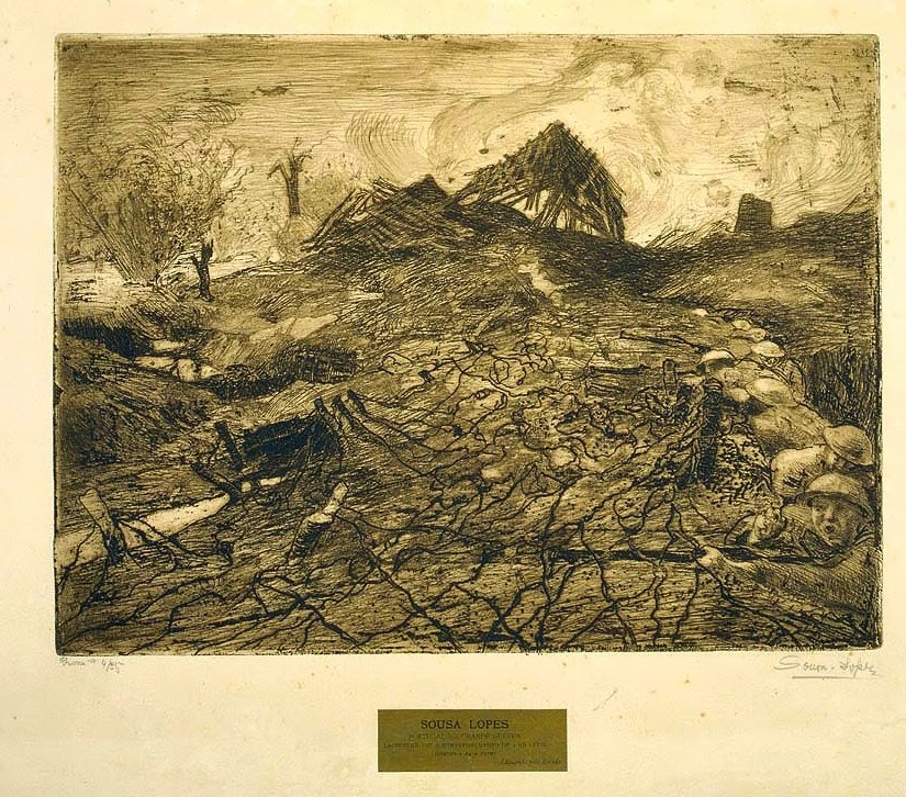 Portugal na Grande Guerra; Lacouture sob o bombardeamento de 9 de Abril de 1918 (Batalha de La Lys). Gravura; água -forte. Autor: Adriano Sousa Lopes (À direita - uma companhia de soldados portugueses, encurralados numa trincheira da 1ª linha). Museu do Chiado - Museu Nacional de Arte Contemporânea - MatrizNet