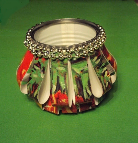 4 - Coloque as tiras em volta do perímetro da lata e cole. Decore com os elementos à sua vontade (imagem 5).