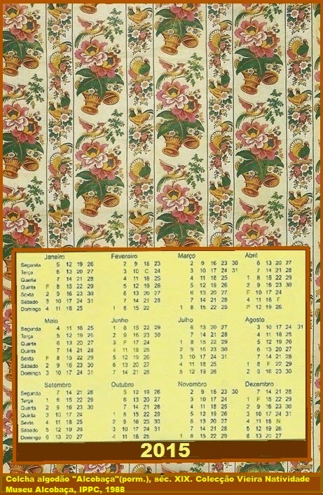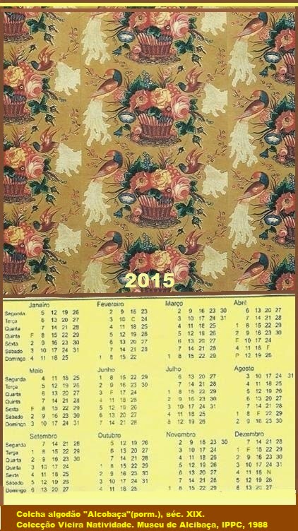 Os calendários que criei para 2015, têm como tema os lenços e as chitas de Alcobaça. Quem não se lembra dos panos de cores fortes com motivos de pássaros e flores? Nas casas de férias, era comum realizar colchas e cortinados com estes panos.