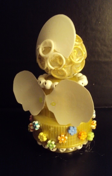 7 - Aureola: recorte o fundo da terceira embalagem de iogurte. Cole sobre a cabeça com cola a quente (imagens 9 e 10).